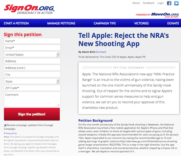“Apple: The National Rifle Association’s new app ‘NRA: Practice Range’ is an insult to the victims of gun violence, having been launched on the one month anniversary of the Sandy Hook shooting,” the petition states. “Out of respect for the victims and to signal Apple’s support for common sense measures to help end gun violence, we call on you to rescind your approval of this shameless new product.”